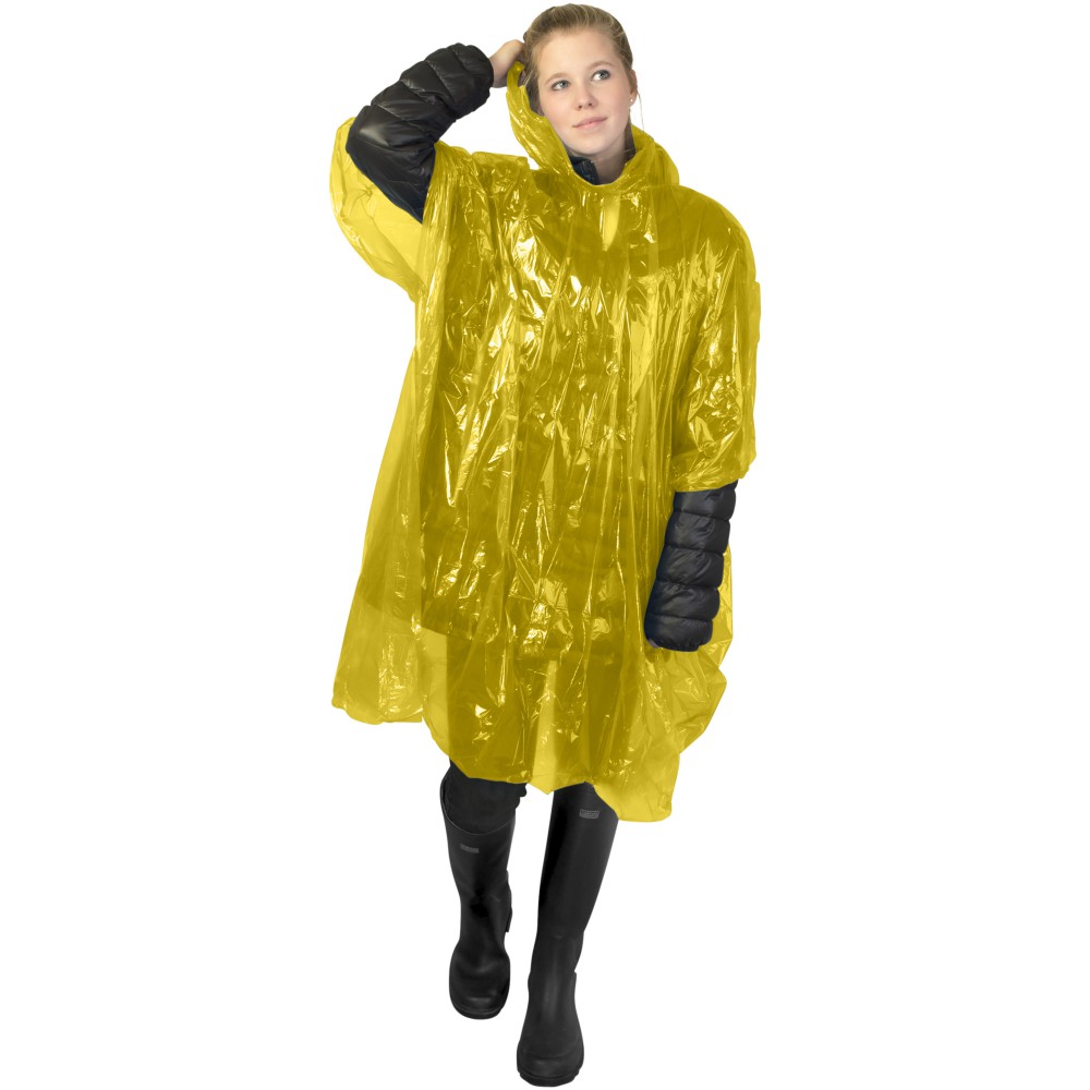 A Maya eldobható esőponcsó 100%-ban újrahasznosított műanyagból készült. Ez az átlátszó, kapucnis poncsó ideális, ha egy szabadtéri fesztiválon vagy bármilyen más szabadtéri rendezvényen elkapja az eső. Nyomtatásra alkalmas tasakkal szállítjuk. Méret: 90 x 120 cm.