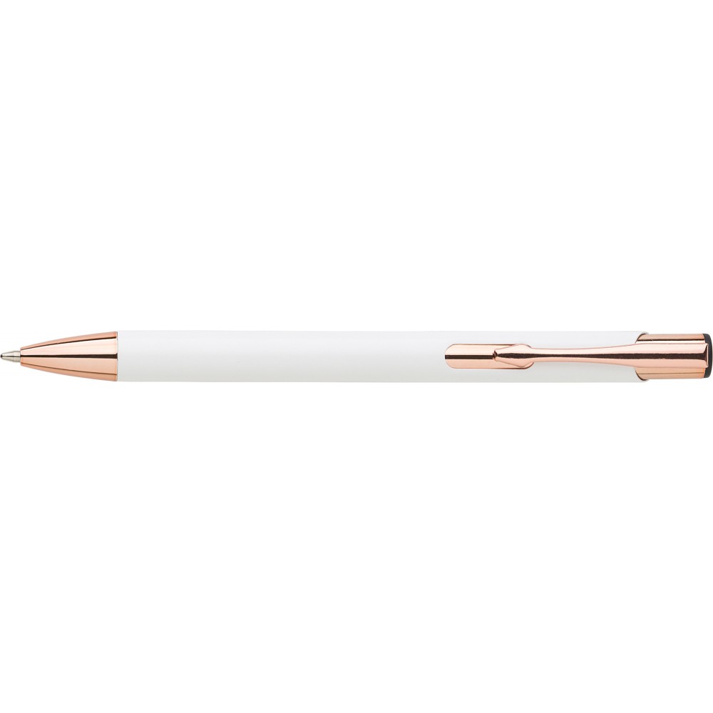Alumínium golyóstoll matt felülettel, rózsaarany részletekkel, kék tollbetéttel.