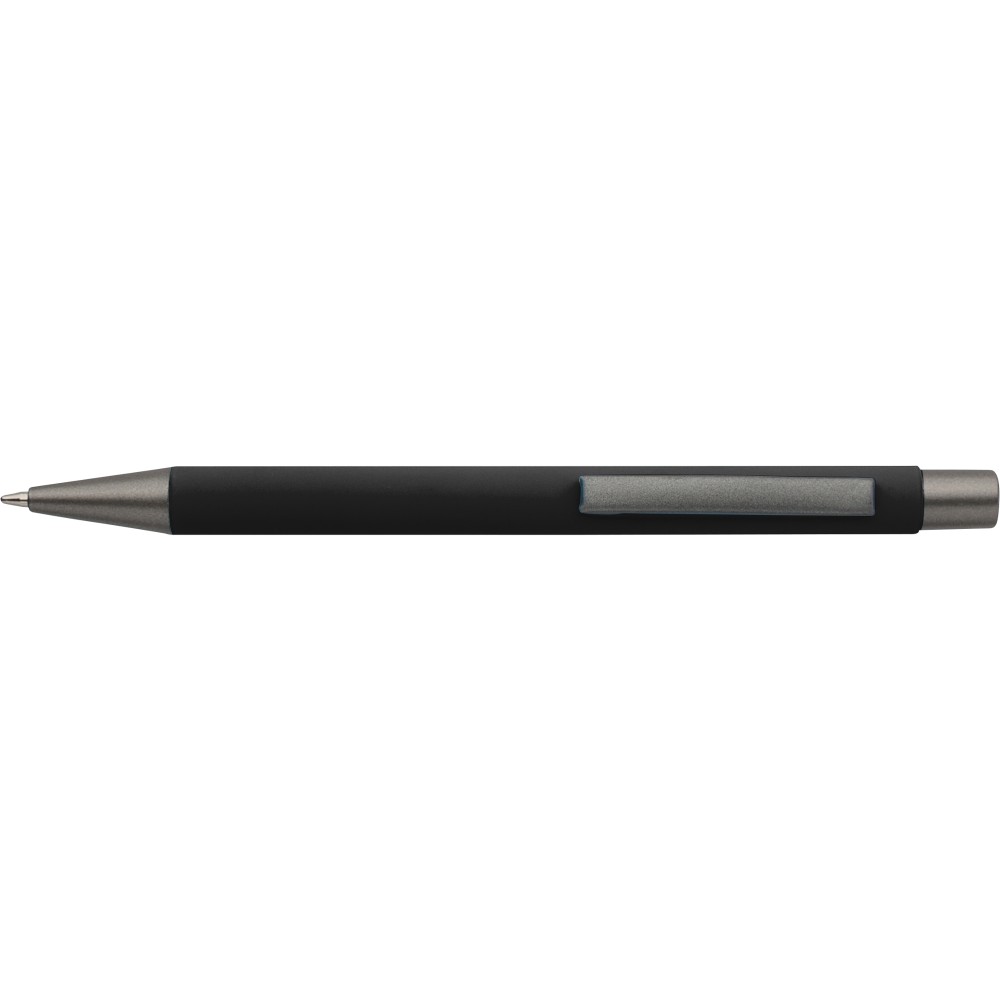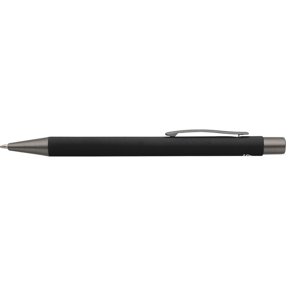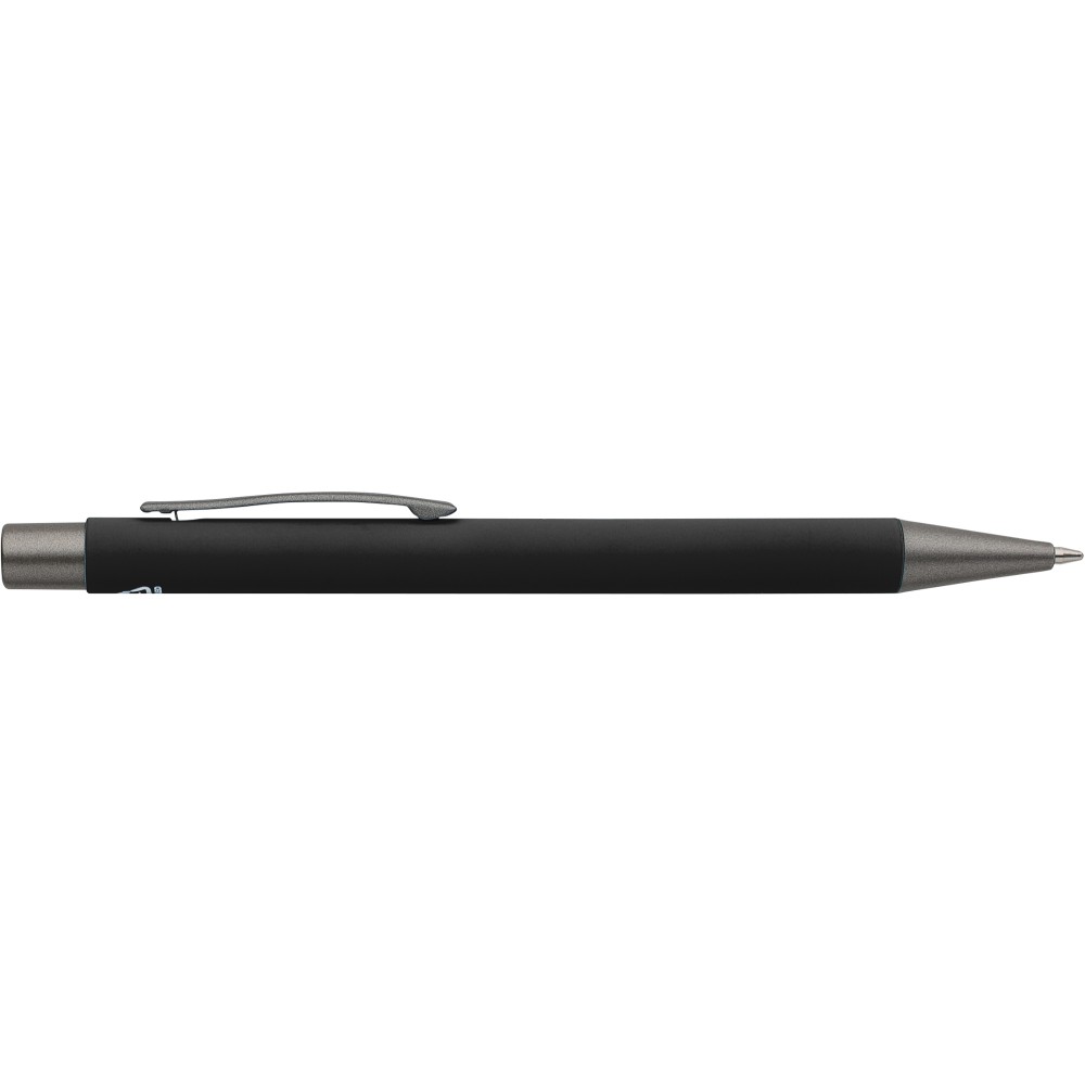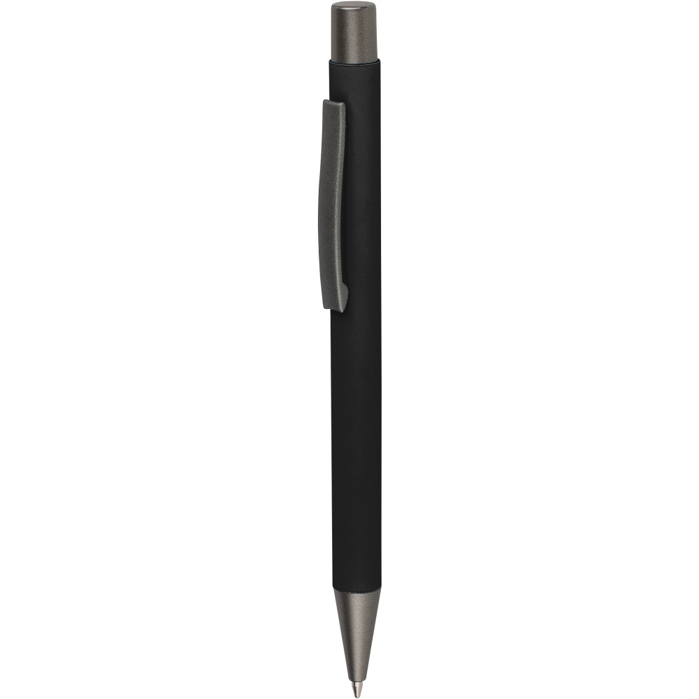 Újrahasznosított alumínium golyóstoll lágy tapintású gumírozott felülettel és kék tollbetéttel. Sötétszürke kiegészítőkkel és a bevonat alatti tükörhatású réteggel tervezve a látványos gravírozási eredmény érdekében. Nyomógombos szerkezettel és gravírozott újrahasznosított logóval.