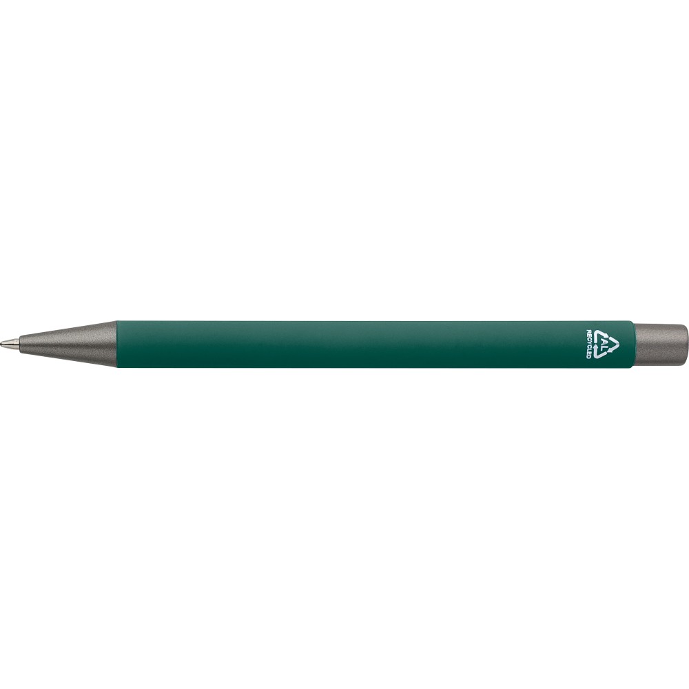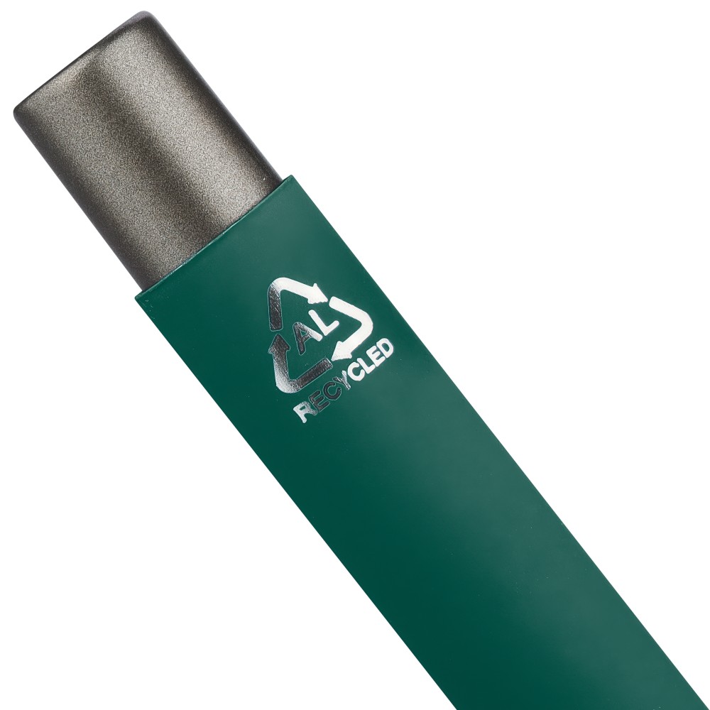 Újrahasznosított alumínium golyóstoll lágy tapintású gumírozott felülettel és kék tollbetéttel. Sötétszürke kiegészítőkkel és a bevonat alatti tükörhatású réteggel tervezve a látványos gravírozási eredmény érdekében. Nyomógombos szerkezettel és gravírozott újrahasznosított logóval.