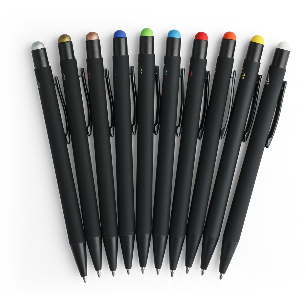 Újrahasznosított alumínium golyóstoll fekete, gumírozott felülettel és kék tollbetéttel. Színben illeszkedő kiegészítőkkel ? beleértve a belső tolltestet és az érintőképernyőkhöz használható stylus véget ?, amelyek kifinomult kontrasztot alkotnak gravírozáskor. Nyomógombos szerkezettel és gravírozott újrahasznosított logóval.