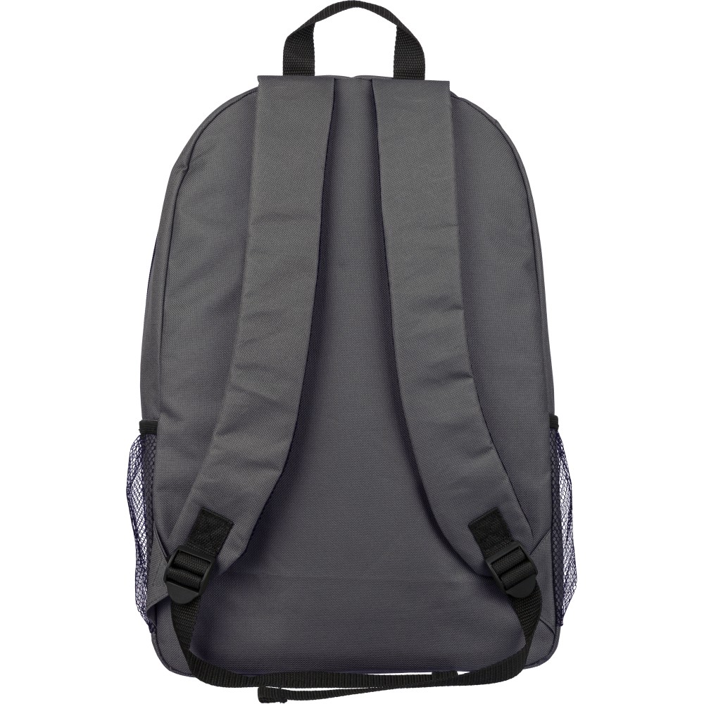 RPET poliészter 600D anyagból készült hátizsák húzózsinóros záródással és nagy cipzáras fő rekesszel. Hálós oldalzsebekkel, rugalmas elülső pántokkal, dekorációhoz kialakított kis elülső cipzáras zsebbel és állítható vállpántokkal rendelkezik. A terméken rPET alapanyagra utaló címke található.