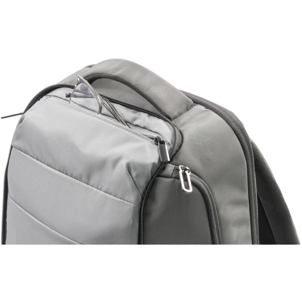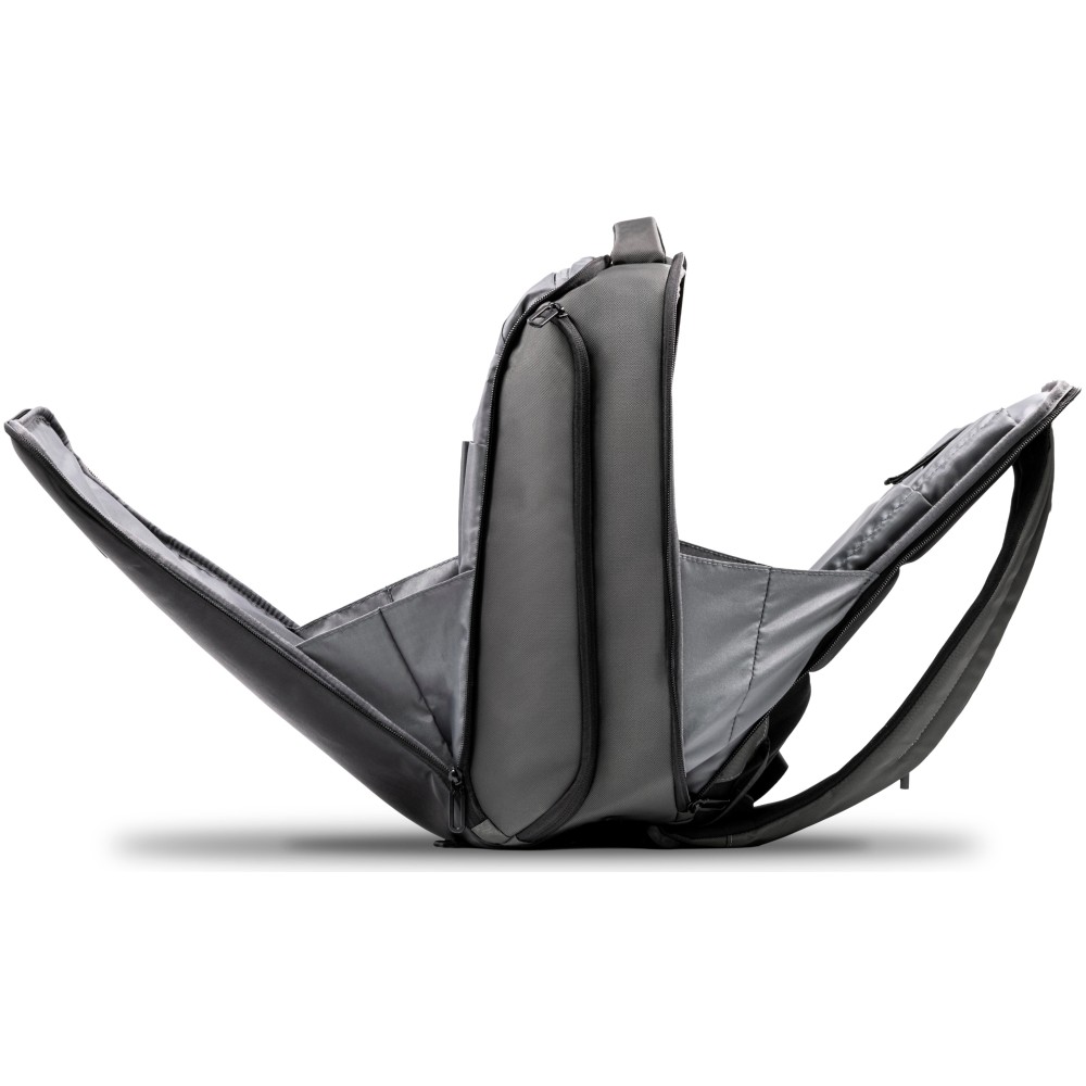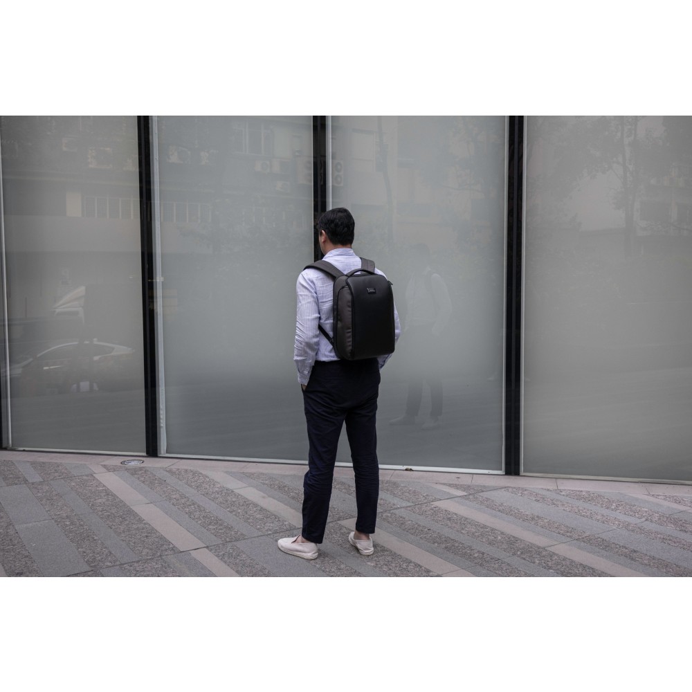 800D hátizsák víz- és szennyeződéslepergető újrahasznosított, nagy kopásállóságú, ballisztikus szövetből, vegán bőr elemekkel. 22 literes űrtartalommal rendelkezik, párnázott rekesszel legfeljebb 16 hüvelykes laptophoz. Hátsó lopásgátló rekesszel, integrált szemüvegtartó rekesszel, két oldalsó tárolóval és bőröndre rögzíthető pánttal kialakítva. Puha tapintású, szellőző hátpárnázással ellátva, mindennapi használatra vagy utazáshoz alkalmas.