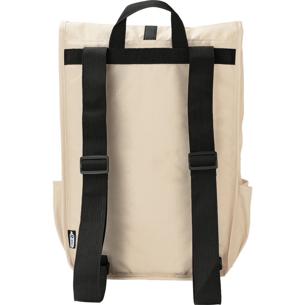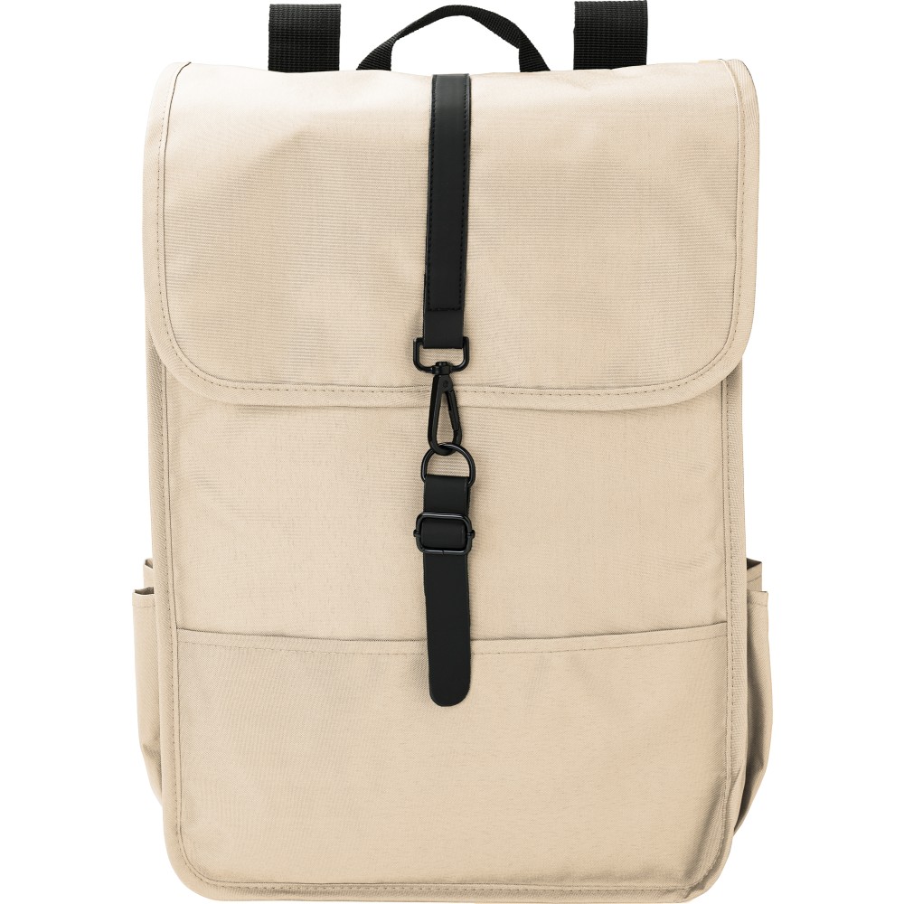 Hátizsák. Két palackzseb az oldalán, egy nagy rekesz. Fekete PU pánttal, csattal zárható. 300D RPET poliészter.