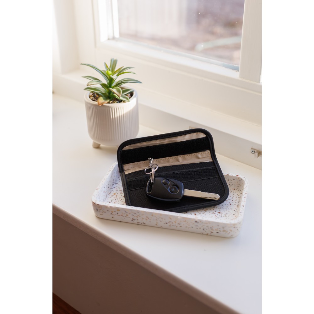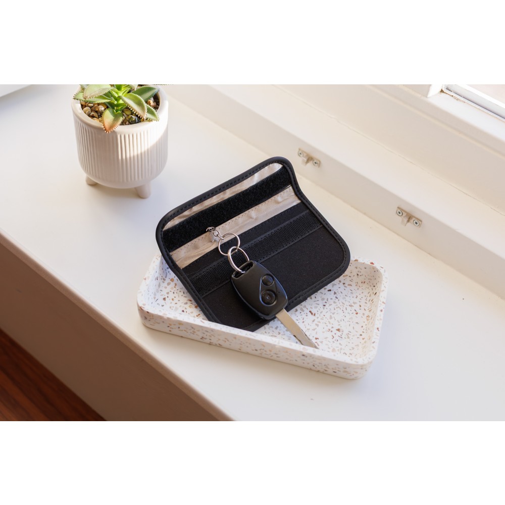 600D poliészter tok tépőzárral, kulcsok és kártyák tárolására tervezve. Újrahasznosított PET (rPET) és PU anyagból készült. Beépített RFID-védelemmel rendelkezik, amely megakadályozza az adathalászatot vagy a kulcsokhoz való illetéktelen hozzáférést. Belső kulcskarikát és tépőzáras fedelet tartalmaz.