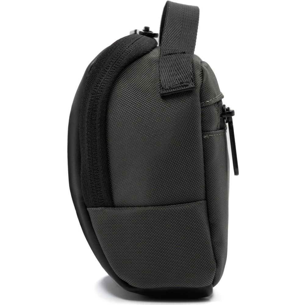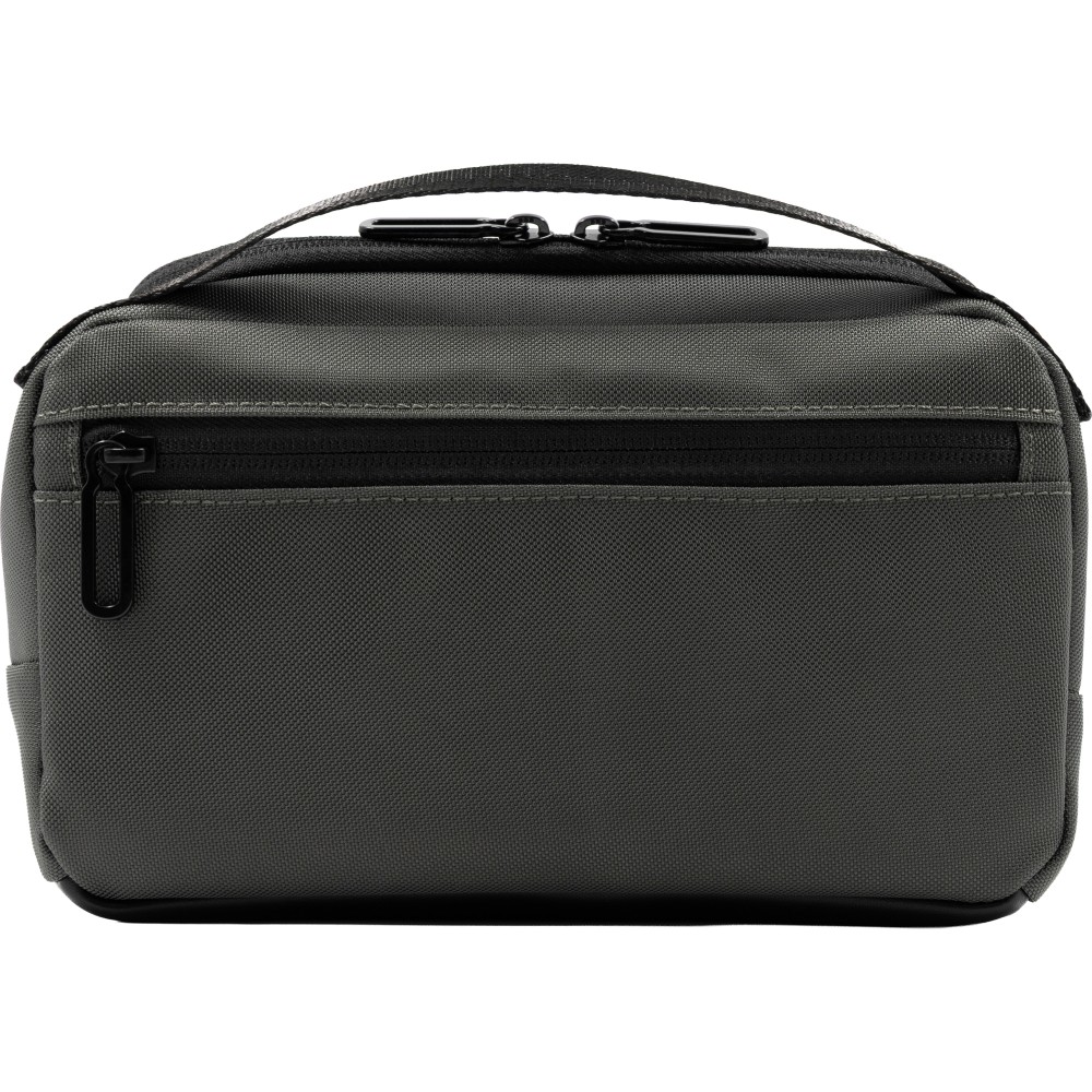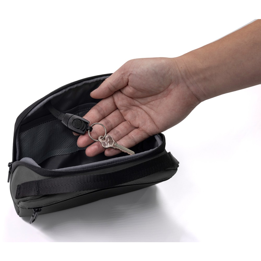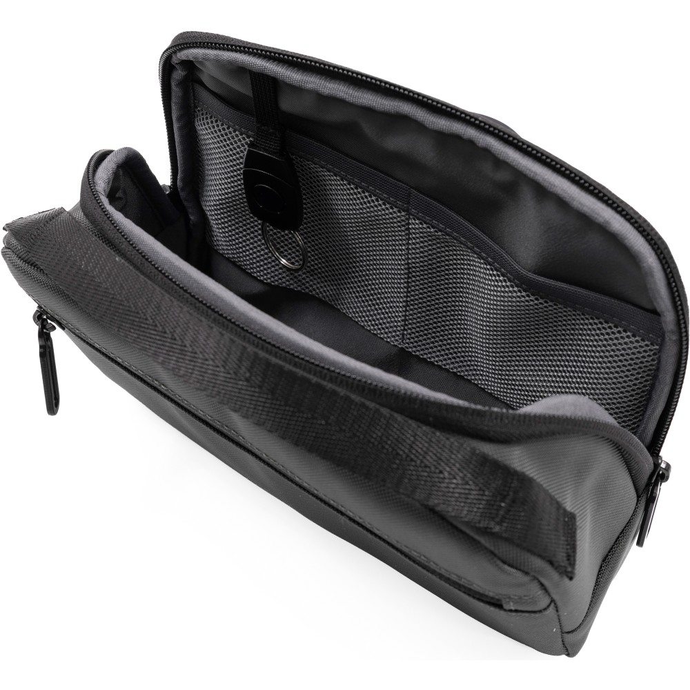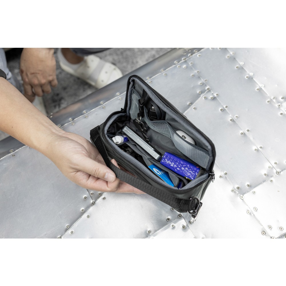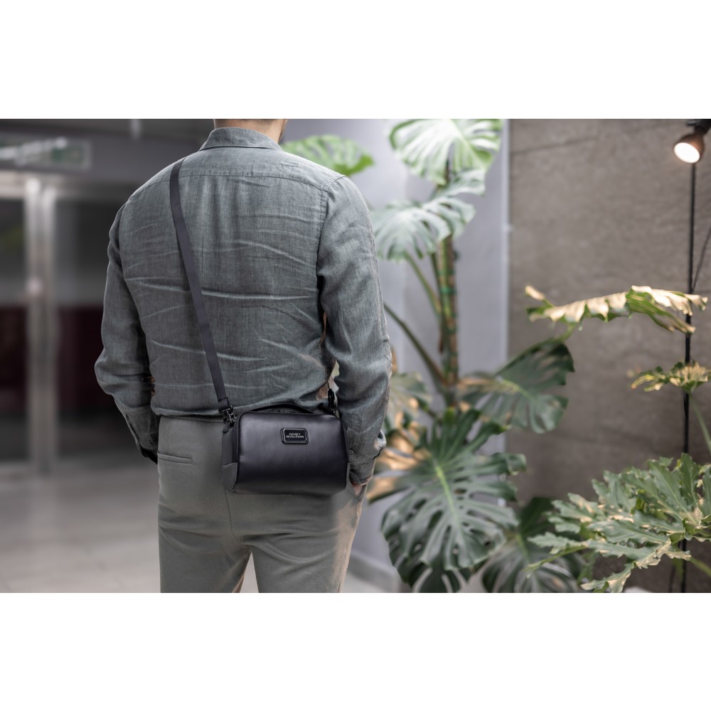 Kompakt és fenntartható mindennapi táska, amely vegán bőrből és újrahasznosított 800D ballisztikus poliészterből készült. Munkához, utazáshoz és napi használatra tervezve. 2,2 literes kapacitás, okos belső elrendezés. A főrekesz öt al-zsebbel és négy rugalmas hurokkal rendelkezik, hogy az olyan alapvető dolgokat, mint a telefon, pénztárca, kulcsok és kártyák, rendszerezve tárolhassuk. Egy külön cipzáras rekesz további biztonságos tárolóhelyet biztosít. A táska tartalmaz egy kivehető, integrált kulcstartó klipszet és egy vállpántot a kéz nélküli hordozáshoz. Mindkét oldalon két rögzítőhurok található kiegészítők vagy karabiner felakasztásához. A víz- és koszlepergető anyagok garantálják a tartósságot. Emblémázása a mellékelt gravírozható lapon lehetséges.