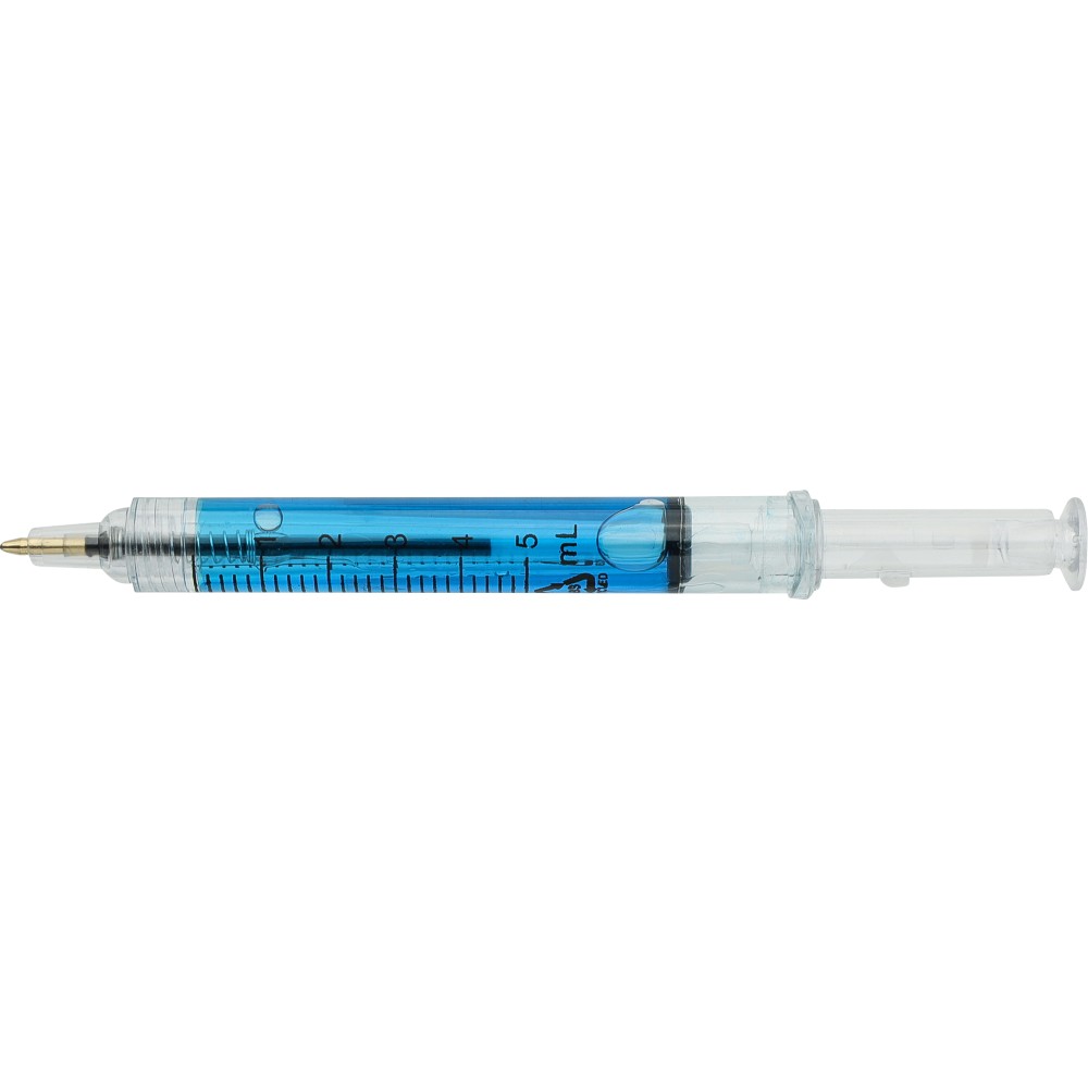 Színes folyadékkal töltött fecskendő alakú golyóstoll. Újrahasznosított ABS-ből készült, nyomógombos szerkezetű, fekete tollbetéttel szállítjuk. Érintőképernyőkhöz használható stylus véggel rendelkezik. In-mould (öntőformában elhelyezett) újrahasznosított ABS logóval díszítve.
