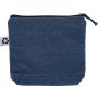 Újrahasznosított farmeranyagból készült kozmetikai táska 21 × 18,5 cm méretben, egy cipzáras fő rekesszel és a külső felületen elhelyezett újrahasznosított alapanyagra utaló címkével.