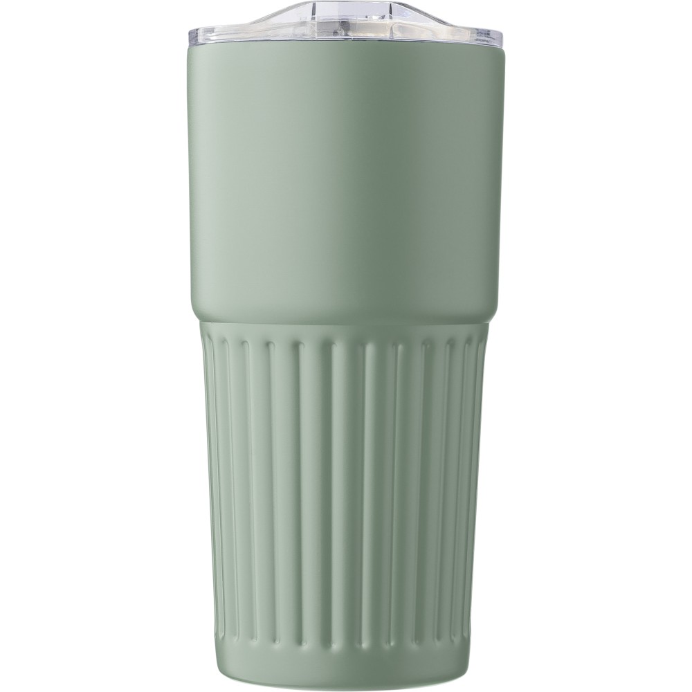Újrahasznosított rozsdamentes acélból készült, duplafalú ivópohár (500 ml). Belső része 304-es, külső része 201-es rozsdamentes acél, bordázott fogófelülettel. AS fedéllel rendelkezik csúsztatható zárással. A palacktesten gravírozott recycled (újrahasznosított) alapanyagra utaló logó található. Darabonként barna kartondobozba csomagolva.