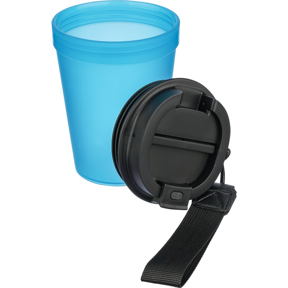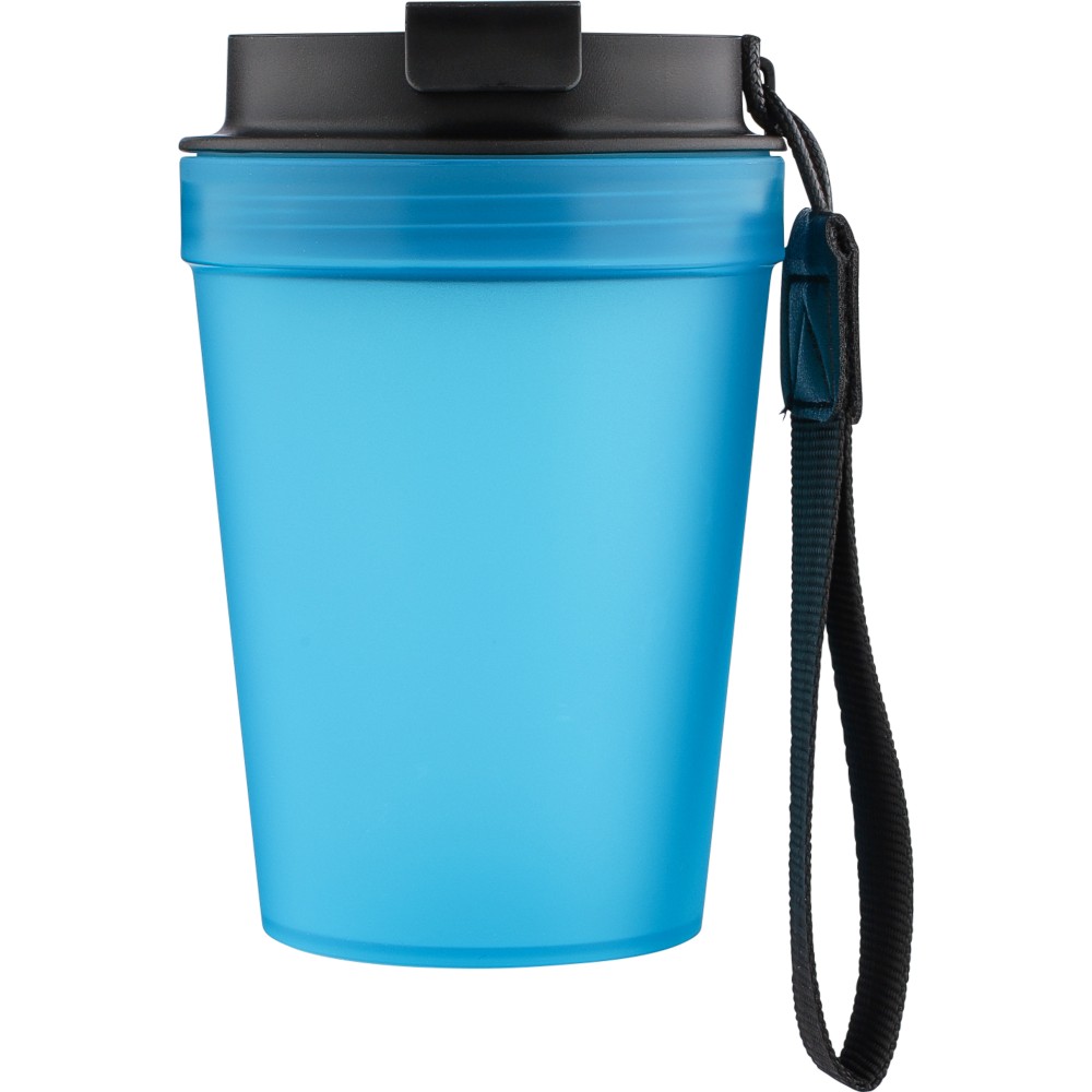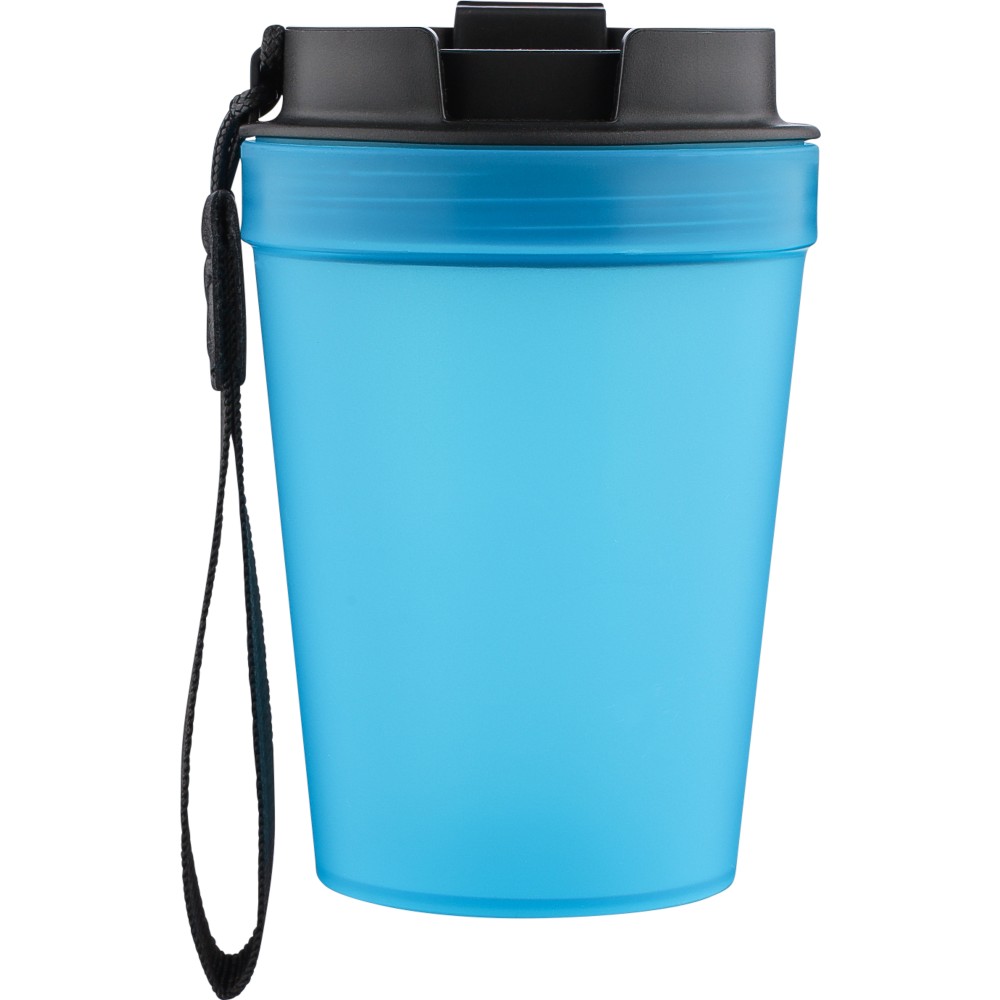 Átlátszó, szimplafalú ivópohár 350 ml-es űrtartalommal, vastagfalú kialakítással. Csavaros fedéllel és poliészter csuklópánttal rendelkezik a könnyű hordozhatóság érdekében. Tartós, ütésálló, megbízható termék. Meleg italokhoz is alkalmas, de kérjük, vegye figyelembe, hogy az egyfalú szerkezet miatt hőátadás előfordulhat.