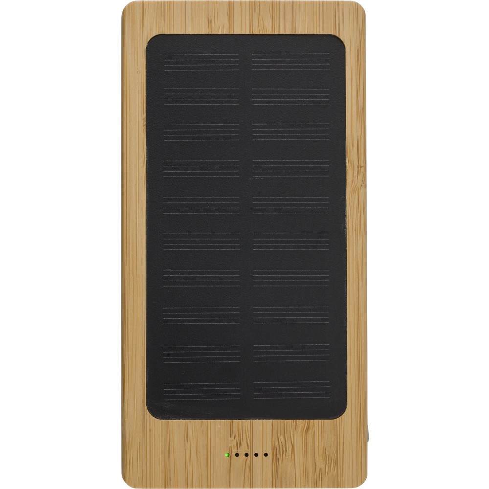 Bambusz napelemes powerbank 8.000 mAh kapacitással. Két USB és egy micro USB csatlakozóval, négy LED jelzőfénnyel. Bemenet: DC 5V/2A, kimenet: DC 5V/2A. A vezetéket tartalmazza. Veszélyes áru, csomagban nem küldhető.
