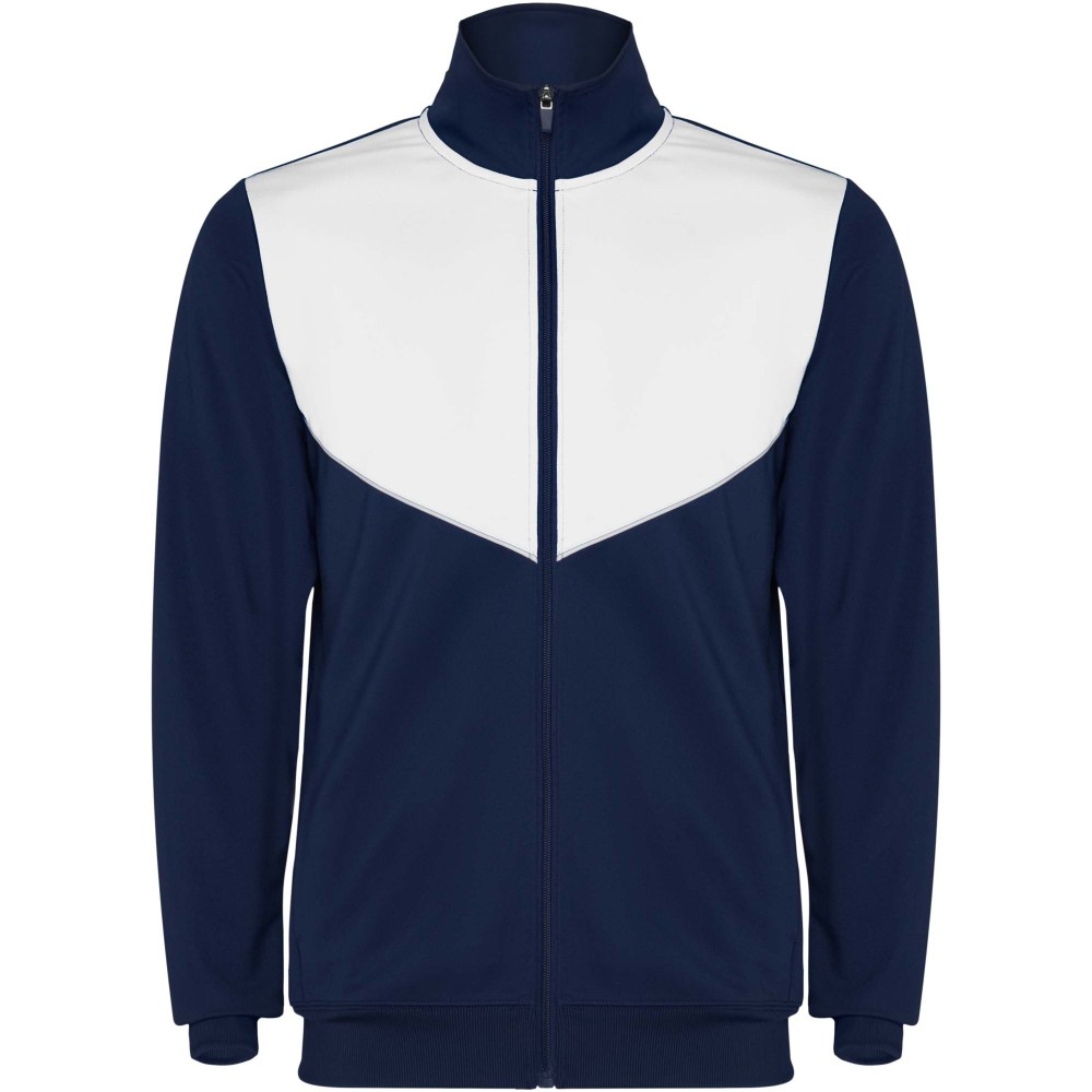 Könnyű és rugalmas anyagból készült melegítő. A végig cipzáros felső kontrasztos színű és varrású díszítésekkel dekorált a mellrészen. Oldalzsebek. Bordázott ujj- és és derékpasszé. Nadrág gumis derékkal és húzózsinórral, kontrasztos oldalsó varrással. Cipzáras szegély.