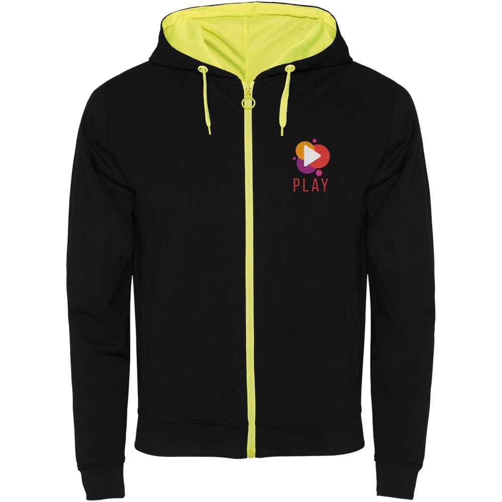 Pulóver neon színű részletekkel. Középső cipzár kontrasztos zsinórral. Kapucni mikropórusos poliészter béléssel és kontrasztos neon színnel. Húzózsinór és fém szemek kontrasztos neon színben. Rugalmas 1x1 kötésű passzék. Két elülső zseb széles szegéllyel. Megerősített, fedett varrások a belső galléron. Levehető címke.
