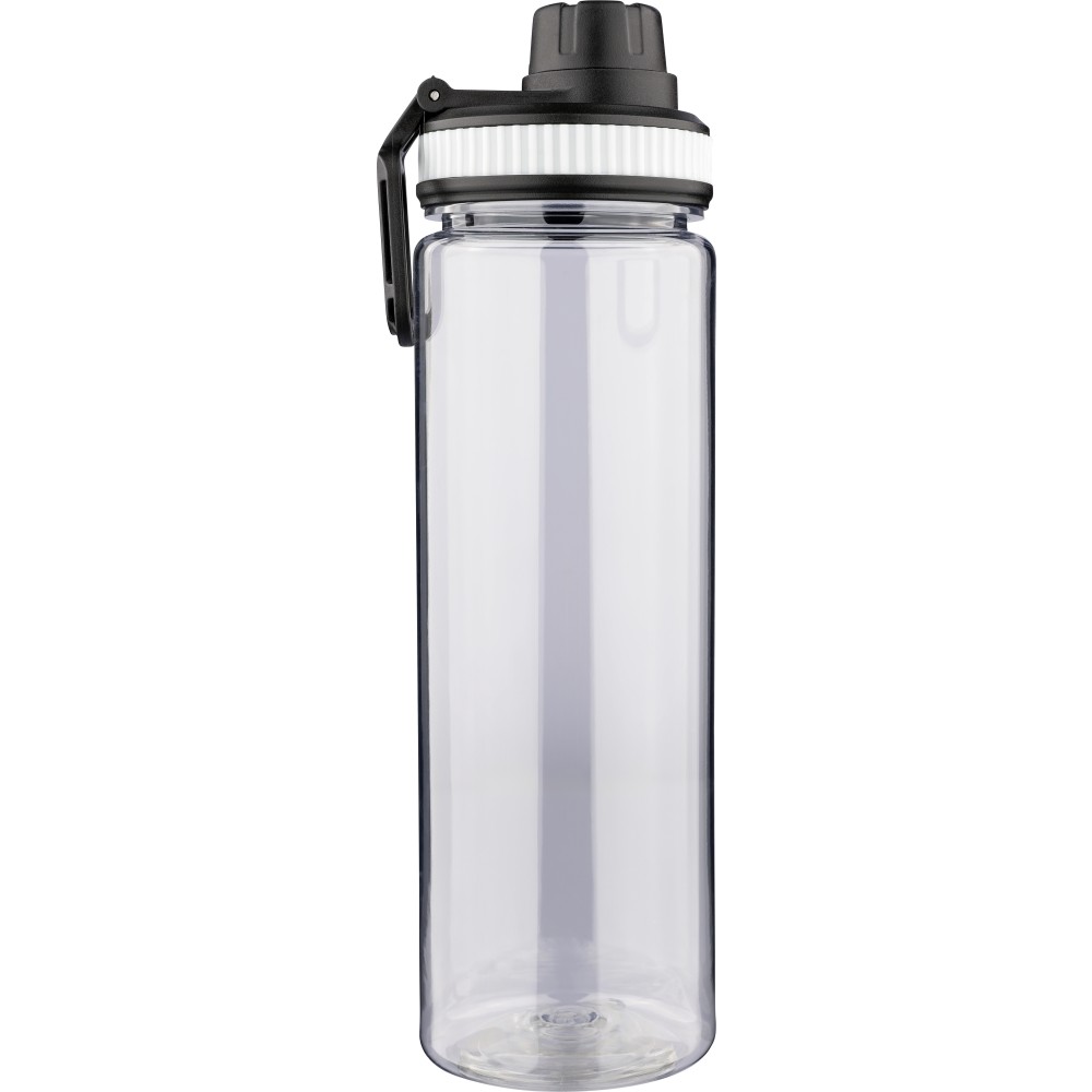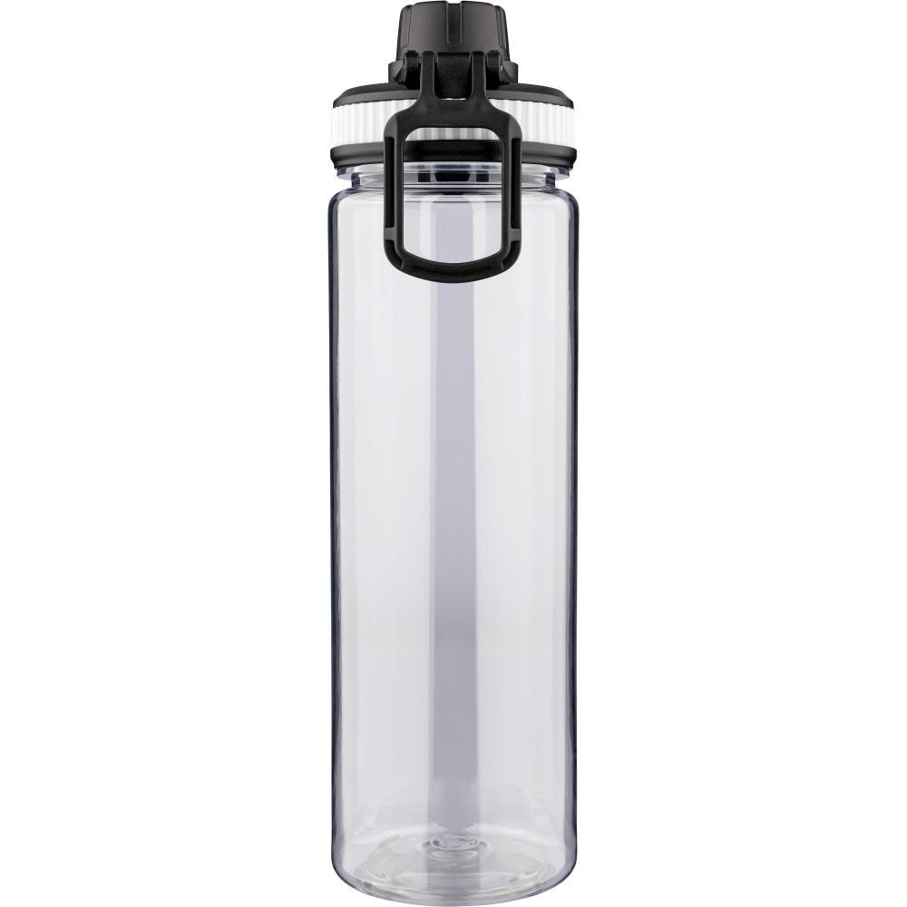RPET anyagból készült ivópalack PP kupakkal, amely hordozófüllel és csavaros záródással rendelkezik, valamint a palack áttetsző testének színével harmonizáló szilikon díszítéssel. Űrtartalma 750 ml.