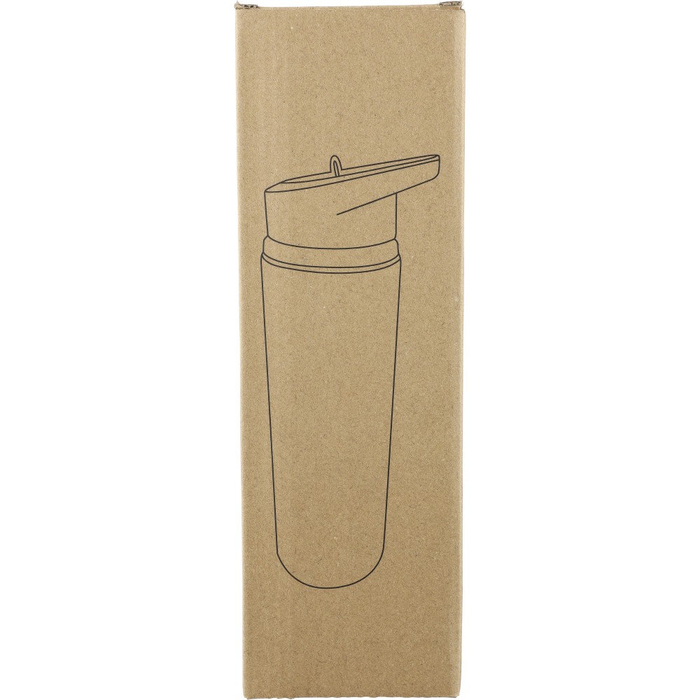 Újrahasznosított rozsdamentes acélból készült, egyfalú ivópalack rozsdamentes acél 304 anyagból, PP csavaros kupakkal, hordozófüllel, felhajtható ivószárral és belső szívószállal. Kizárólag hideg italokhoz használható, űrtartalma 500 ml. A palacktesten gravírozott recycled (újrahasznosított) alapanyagra utaló logó található. Darabonként barna kartondobozba csomagolva.