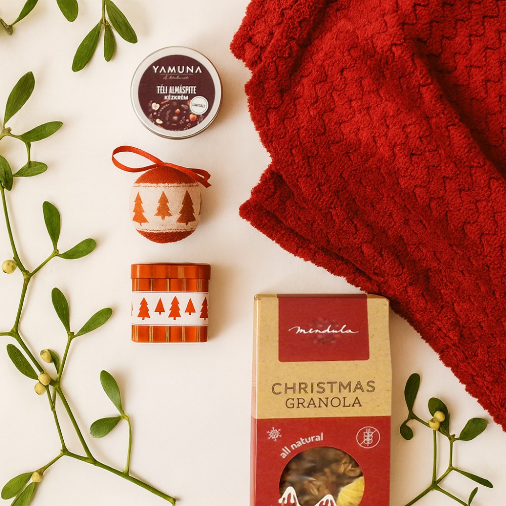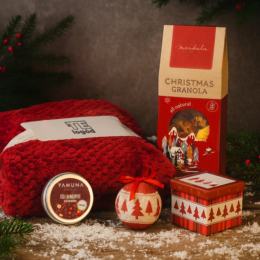Ez a válogatás gazdag, ünnepi hangulatot áraszt, ahol a kényeztető apróságok és az intenzív ízek dominálnak. A csomag tartalma: karácsonyi granola, 300 g (G20511), kézkrém, 50 g (G20426), gömb karácsonyfadísz (CX1437-99), polártakaró waffle mintával (976631-10). Csomagolási lehetőségekről érdeklődj ügyfélmenedzserednél! A kép illusztráció. A kínálatunkban szereplő termékek igény szerint kombinálhatók. A csomagot rendelés esetén állítjuk össze. Várható szállítási határidő: kb. 2 hét. A termékek emblémázását és csomagolását nem tartalmazza a csomag ára. A csomagban szereplő élelmiszer és krém csak csomag részeként rendelhető. Csomagoló anyagok