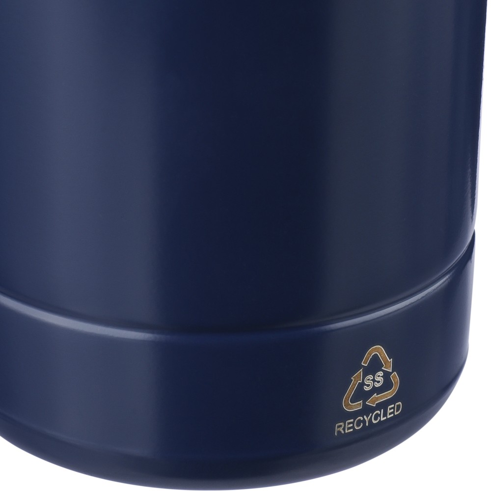 Újrahasznosított rozsdamentes acélból készült duplafalú, vákuumszigetelt termosz, 500 ml-es. Belseje 304-es, külseje 201-es rozsdamentes acél. Csavaros PP kupakkal, poliészter hordozópánttal. Hőszigetelésre és mindennapos használatra tervezve. Az újrahasznosított anyagra utaló gravírozott logóval. Csomagolása barna papírdoboz.