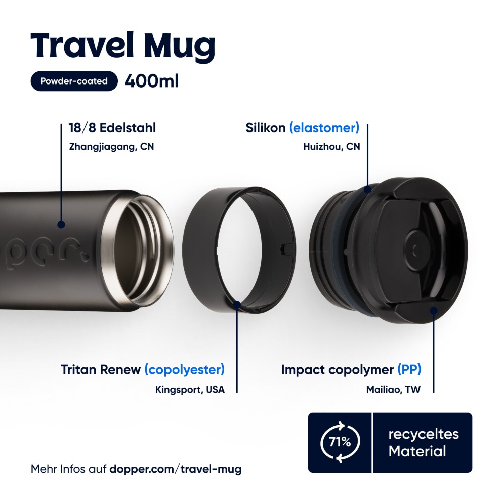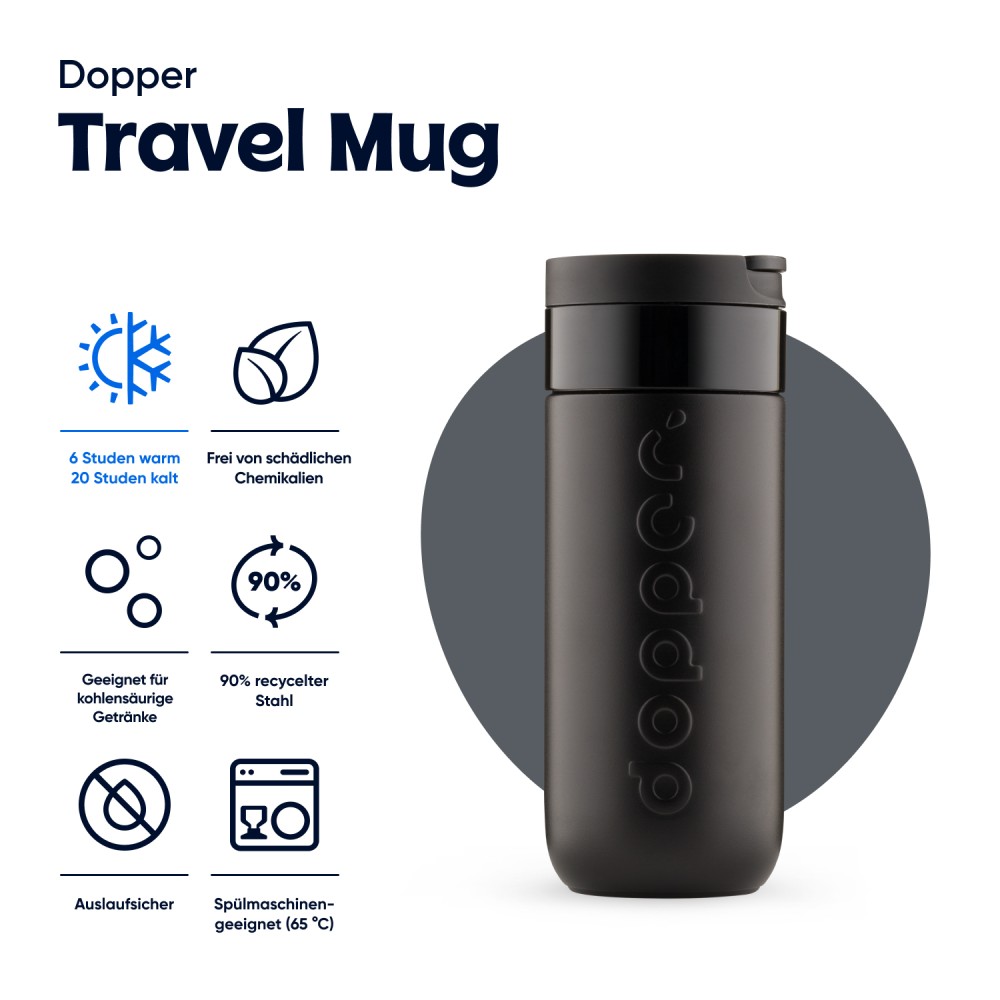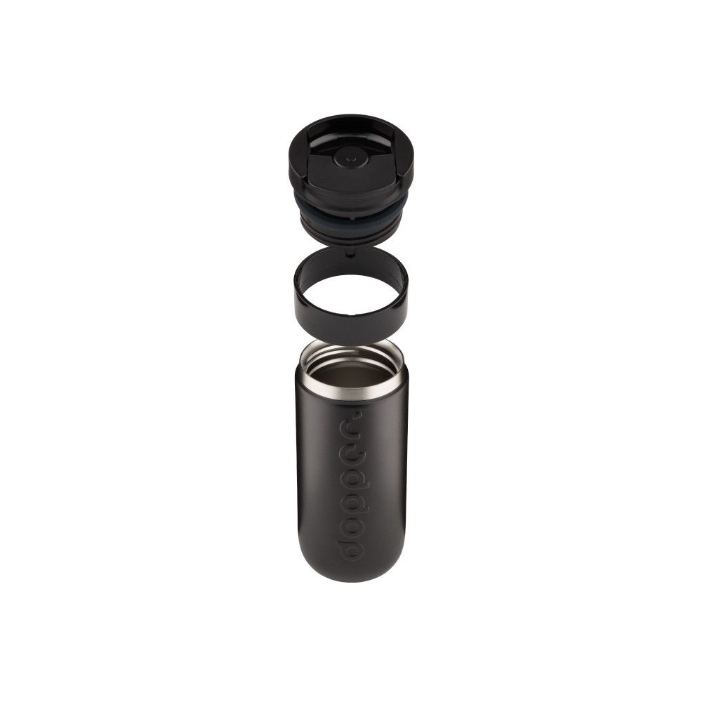 Reggeli koffeinlöket, napközbeni hidratálás vagy esti frissítő pezsgés ? ez a Dopper Travel Mug mindenre készen áll, bárhová is tartasz. Gőzölgően melegen tartja a forró italokat, hűvösen a hidegeket, és megőrzi a szénsavas italok buborékait is. Nincs szivárgás, nincs macera, nincs súlyfelesleg ? és határozottan nincs egyszer használatos hulladék. Könnyen nyitható, lepattintható kupakkal rendelkezik; az italokat akár 6 órán át melegen, 20 órán át pedig hidegen tartja. Duplafalú, 90%-ban újrahasznosított rozsdamentes acélból készült, tartós bevonattal ellátva. Mosogatógépben (emblémázás nélkül nélkül) 65 °C-ig mosható. Kávé vagy tea használata esetén elszíneződés vagy szagmaradvány előfordulhat. Forró folyadékok esetén fokozott óvatossággal használja!