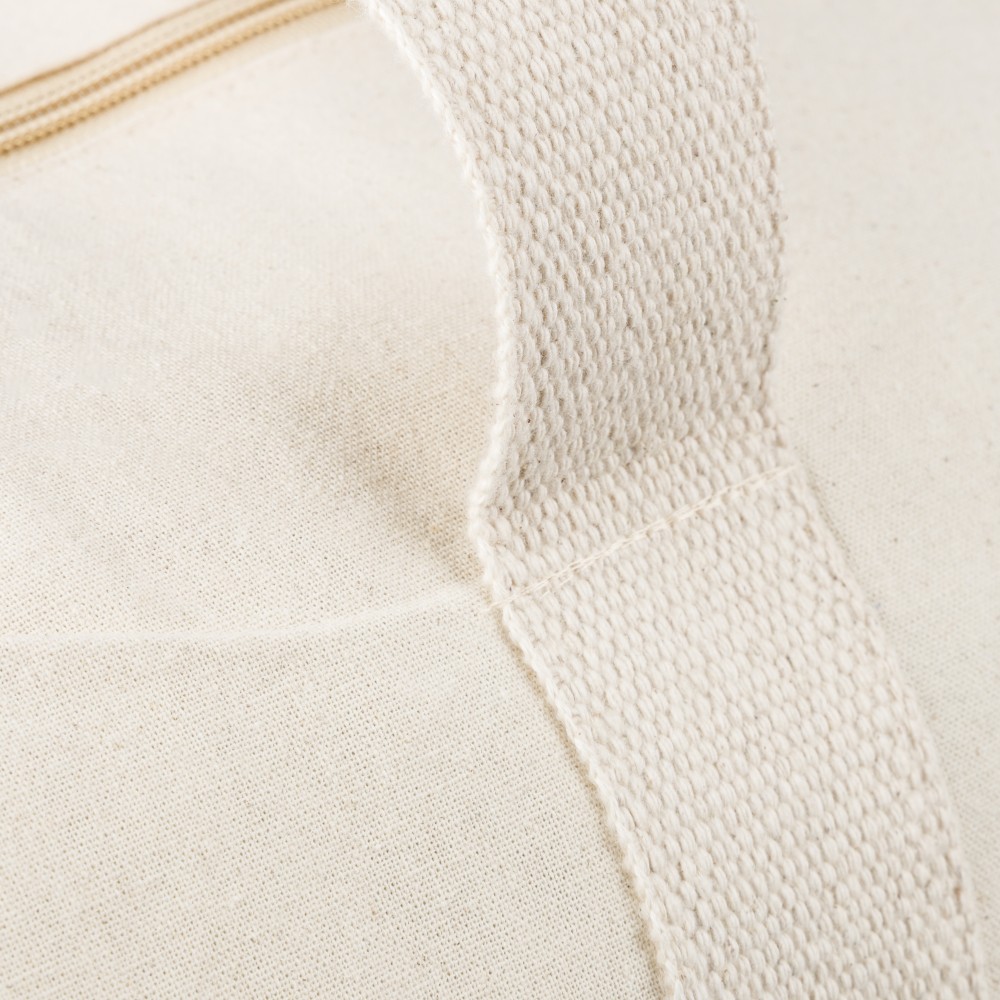 Oeko-Tex minősítésű, 180 g/m2 pamutból készült natúr színű, cipzáras sporttáska 60 cm hosszúságú és 5 cm szélességű pamutfülekkel. Oeko-Tex címkével ellátva.